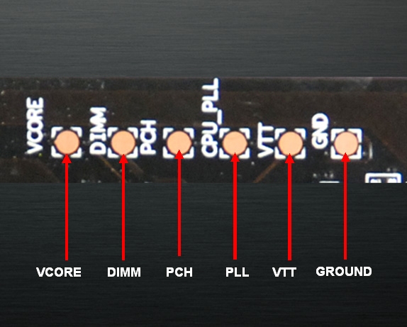 エンスージアスト向け機能として、電圧を実測できるポイントをマザーボード上に配置してあります。テスターを使えば、簡単に電圧を読み取ることができます。
